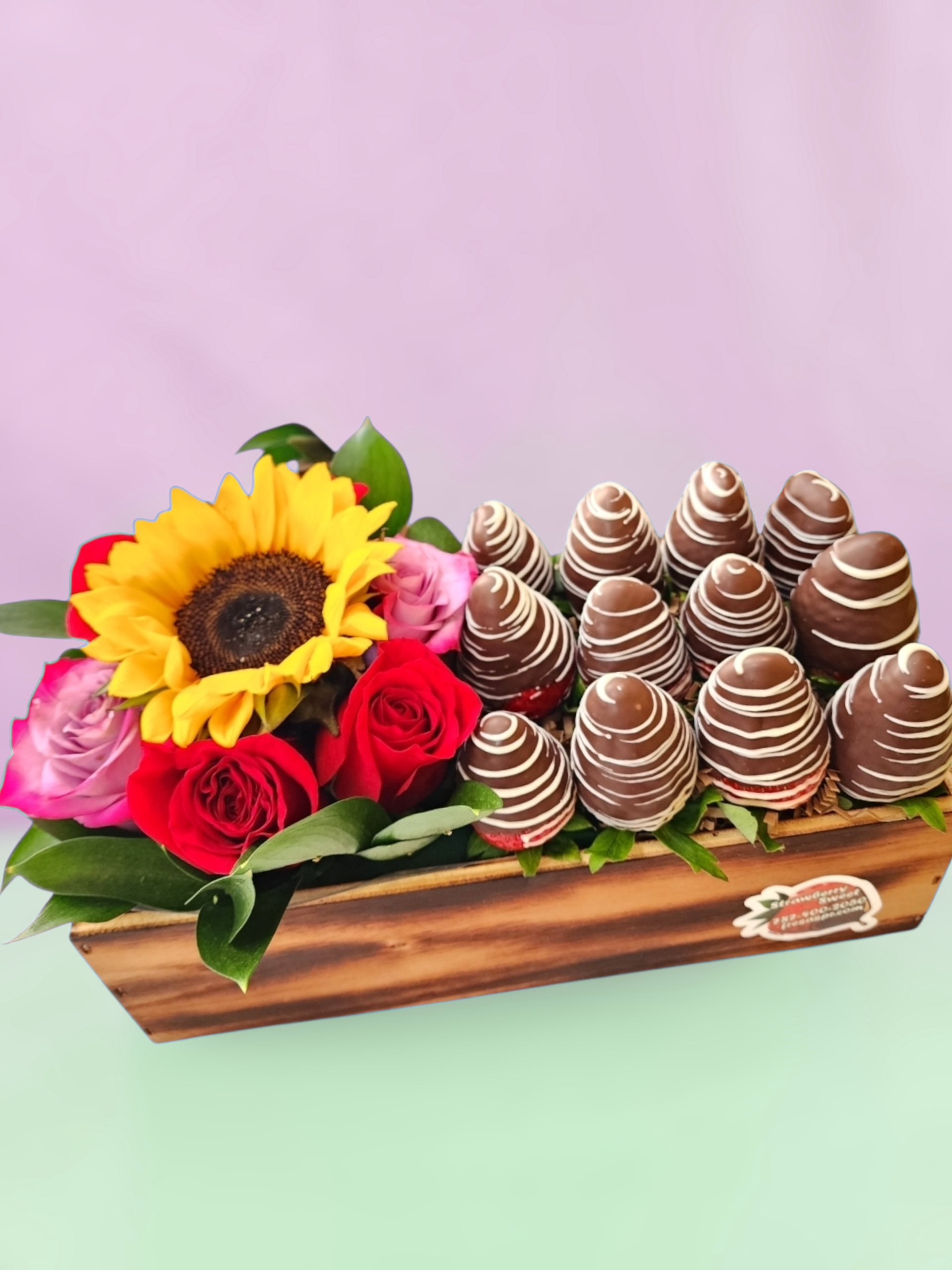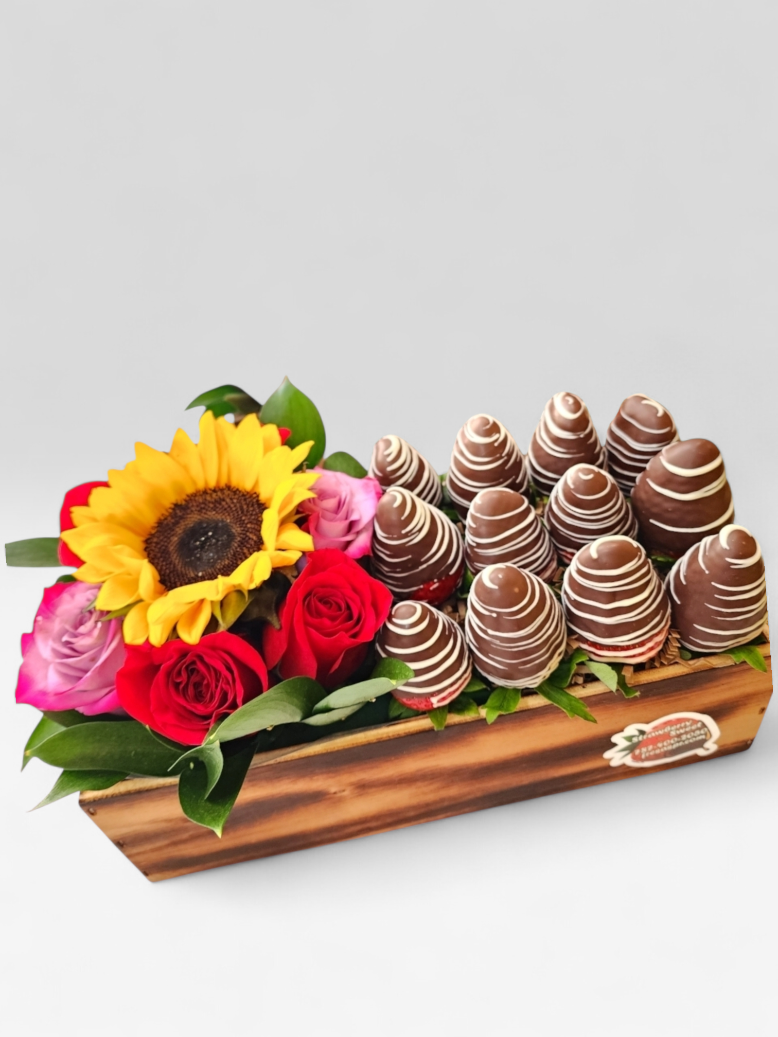 Hermosa caja reusable en madera, con combinación perfecta entre flores fresas y fresas con chocolate.