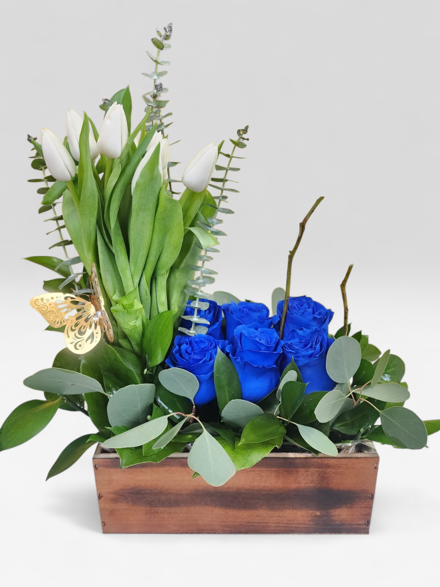 Blue Serenity es un arreglo floral que transmite calma, elegancia y exclusividad. La pureza de los tulipanes se fusiona con la intensidad sofisticada de las rosas azules, un diseño moderno que resalta cada flor con equilibrio y distinción.