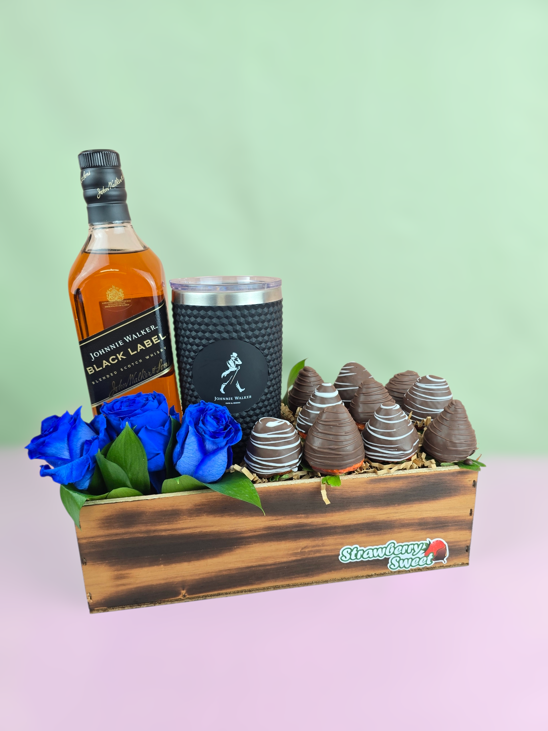 Un arreglo imponente y distinguido que combina la elegancia de rosas azules con exquisitas fresas cubiertas de chocolate y una botella de Johnnie Walker Black Label. Imperial Blue, diseñado para el hombre moderno que aprecia los detalles finos, este arreglo transmite carácter, exclusividad y buen gusto, convirtiéndose en el regalo ideal para San Valentín. Romance