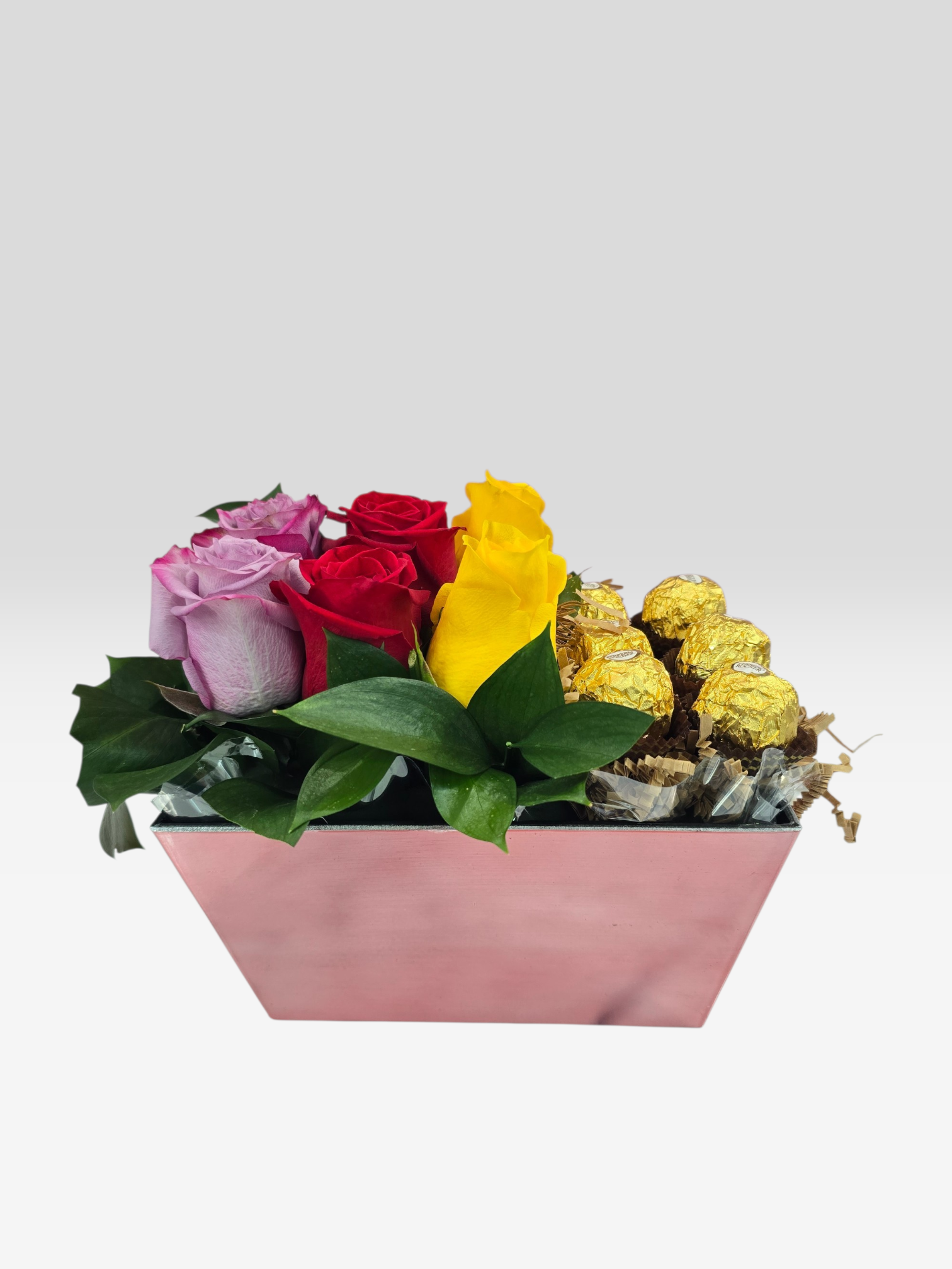 Hermoso arreglo de rosas y Ferrero Rocher